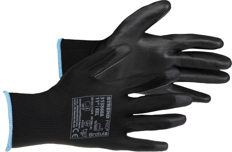 Rukavice Brotula sú zhotovené z čierneho nylonového úpletu bez švov. Dlaň a prsty majú potiahnuté tenkou vrstvou čierneho polyuretánu. Pružný úplet na zápästí.