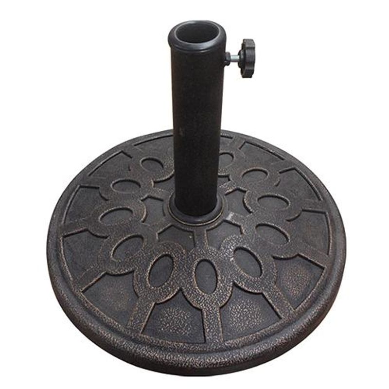 Stojan na plážový slnečník alebo dáždnik je vyrobený z pevného prírodného živicového materiálu. Spodná podstava vizuálne pripomína skôr kovový charakter, no oproti klasickému kovovému nie je tak ťažký. Navyše je celá spodná časť zvýraznená zaujímavým vzorom. Priemer tejto podstavy je 43 cm. Z podstavy vychádza stredová tyč, do ktorej sa napája slnečník. Výška tyče je 33 cm, čím poskytuje dostatočné prekrytie a spojenie častí slnečníka a stojanu. Maximálny priemer tyče požadovaného upevneného slnečníka je v rozmedzí od 38 do 52 mm. Po vložení slnečníka do tyče vychádzajúcej z podstavy je už len potrebné zaistiť ho prikrútením kolieska na boku. Hmotnosť stojanu je 9 kg.